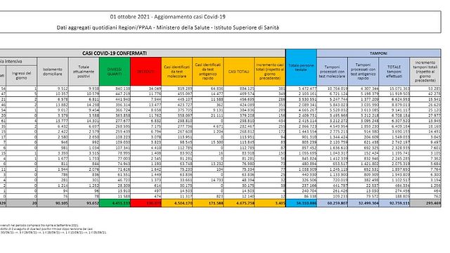 Sono 3.405 i nuovi casi di coronavirus registrati in Italia, a fronte di 293.469 tamponi eseguiti. Il tasso di positività si attesta all'1,2%. Nelle ultime 24 ore i decessi sono stati 52 (ieri erano 51), mentre i guariti sono 4.007. Calano di 11 unità le terapie intensive, mentre sono 80 in meno i pazienti ricoverati negli altri reparti Covid.