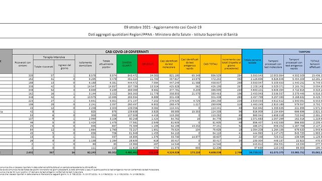 Sono 367 i pazienti ricoverati in terapia intensiva per il Covid. Gli ingressi giornalieri sono 16 (venerdì erano 15). I ricoverati con sintomi nei reparti ordinari sono 2.692.