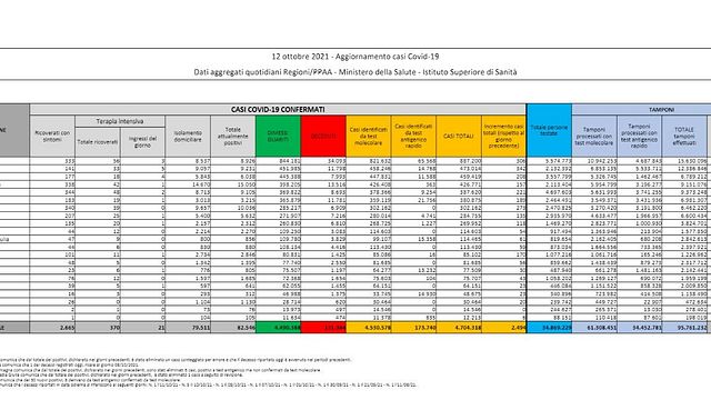 Da inizio pandemia i guariti dal Covid sono 4.490.388. Il totale dei ricoverati in terapia intensiva è di 370 pazienti, sono, invece, 2.665 i positivi nei reparti ordinari.