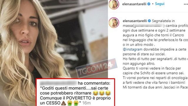 “Segnalatela in massa, cambia profilo ogni due settimane e ogni 2 settimane augura a mio figlio che torni il cancro nel linguaggio che lei preferisce, lo fa così o in un altro modo. Instagram dovrebbe impedire a certe persone di stare sui social. Ho fatto di tutto per segnalarti, di tutto e non aggiungo altro. Quanto ti vorrei vedere in faccia per capire che schifo di essere umano sei. Ti vorrei portare nei reparti di oncologia a farti vedere che vita fanno i bambini! Mi tormenti da due anni, lasciaci in pace!” è lo sfogo della Santarelli che chiede aiuto per difendersi da questa hater che la perseguita.