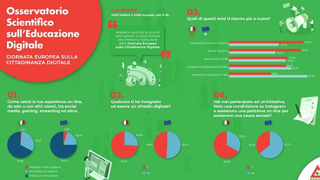 Secondo la ricerca, il 67% dei ragazzi italiani tra gli 11 ed i 18 anni si sente a proprio agio sul web, tra social media, gaming e streaming; la percentuale sale al 75% nel caso degli omologhi europei. Al 74% dei primi, gli italiani, nessuno ha insegnato ad essere cittadini digitali, diversamente dal 47,6% dei ragazzi europei. La questione del gender gap, la lotta al razzismo e alla povertà nel mondo sono i temi che stanno più a cuore agli italiani; il climate change, la lotta alla povertà nel mondo ed i pericoli in rete sono i più sentiti tra i ragazzi europei. Preoccupante è anche la differenza nel numero di ragazzi che utilizzano il web per sostenere una causa sociale: la percentuale tra i giovani italiani è ferma al 33%, è pari al doppio per i ragazzi europei.