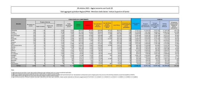 Vaccini - Nelle ultime 24 ore sono state somministrate 181mila dosi (22mila prime + 60mila seconde + 99mila terze), per un totale di 89,6 milioni. Nell'ultima settimana sono state inoculate in media 152mila dosi al giorno (24mila prime + 57mila seconde + 71mila terze): a questo ritmo il 90% degli over 12 sarà vaccinato con ciclo completo tra due mesi e sette giorni (il 4 gennaio 2022).