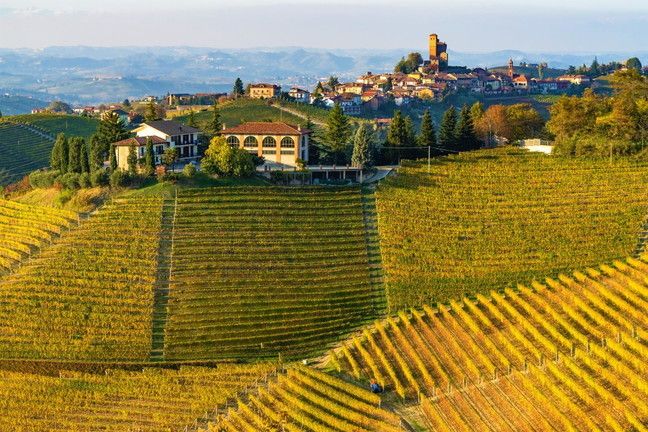 SERRALUNGA D'ALBA, CUNEO - Un maestoso castello, un panorama collinare di grande suggestione, un borgo antico composto da una ragnatela di piccole strade disposte a raggera: intorno a tutto questo il panorama dei meravigliosi vigneti della zona di produzione del Barolo, il re dei vini rossi.