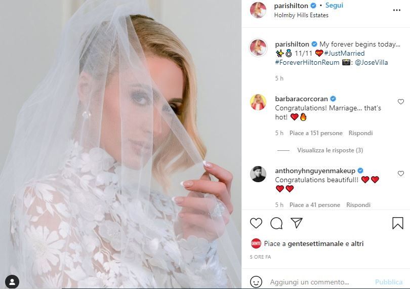 Un matrimonio blindatissimo quello di Paris Hilton e Carter Reum, che si sono detti sì l'11 novembre nella villa di Bel Air del nonno della sposa. Nessuna foto è trapelata dell'evento, se non quelle "rubate" agli ospiti diretti verso la location. Paris però non ha lasciato del tutto a bocca asciutta i curiosi, condividendo sui social uno scatto in abito bianco: "Il mio per sempre inizia oggi" ha scritto.