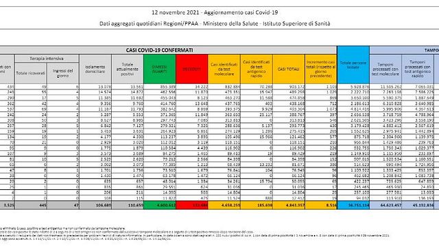 Secondo i dati del ministero della Salute, sono 110.659 gli attualmente positivi al Covid, 3.739 in più nelle ultime 24 ore. Dall'inizio della pandemia i casi totali ammontano a 4.843.957, i dimessi e i guariti a 4.600.612, con un incremento di 4.715 rispetto a giovedì.