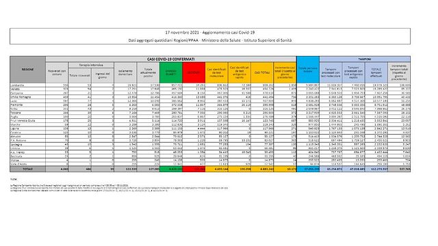 I numeri oggi e un anno fa - Gli attualmente positivi sono oggi 127.085, cioè 3.689 in più. Esattamente un anno fa i nuovi casi erano 34.2828 su 234.834 tamponi, i decessi 753, in terapia intensiva si contavano 58 ricoveri in più per un totale di 3.670 (oggi ce ne sono 486 in tutta Italia) mentre negli altri reparti il saldo ingressi-uscite era di +430, con 33.504 malati di Covid ricoverati (oggi sono 4.060).