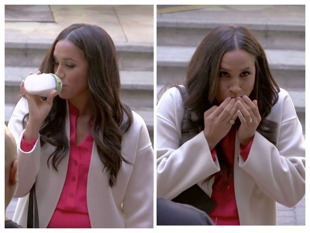 Ha stupito proprio tutti la duchessa di Sussex durante lo show della DeGeneres quando ha bevuto latte da un biberon, mangiato come uno "scoiattolo", cantato una canzone da gattino "mew mew" e ballato "hot hot hot" di fronte a degli ambulanti sbalorditi. La Markle doveva fare uno scherzo a un trio di venditori e ci è riuscita perfettamente. Dallo studio con l’auricolare veniva detto alla moglie di Harry cosa fare e lei non si è certo tirata indietro. Ellen ha fatto sgranocchiare biscotti e patatine a Meghan, mettere le orecchie di gatto e cantare una canzone. Ha assaggiato cibo piccante dalle bancarelle e poi ha poi tirato fuori dalla borsa un biberon pieno di latte e ha iniziato a succhiarlo. Per divertire i figli, la duchessa ha detto che si comporta così: canta, balla e fa le smorfie miagolando e cantando. Poi finalmente è apparsa Ellen DeGeneres che ha spiegato che si trattava di uno scherzo.