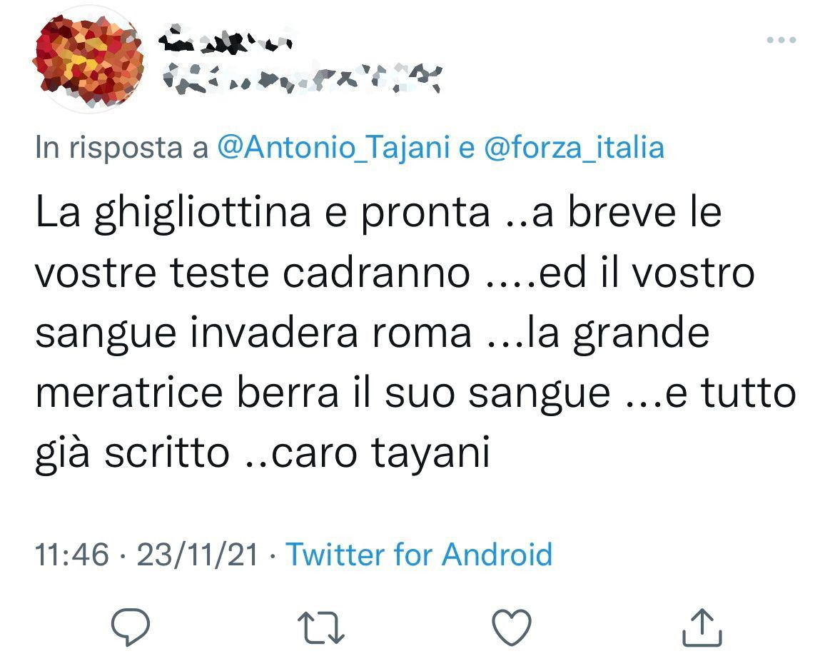"C'è chi mi vuole decapitare o chi mi ricorda cosa hanno fatto le Br. La violenza e le minacce di morte non mi spaventano". Lo scrive su Twitter il coordinatore nazionale di Forza Italia Antonio Tajani, postando le nuove minacce ricevute su Twitter da presunti no vax e no Green pass. "La salute degli italiani viene prima di tutto. Andiamo avanti con vaccini e Green pass", precisa.