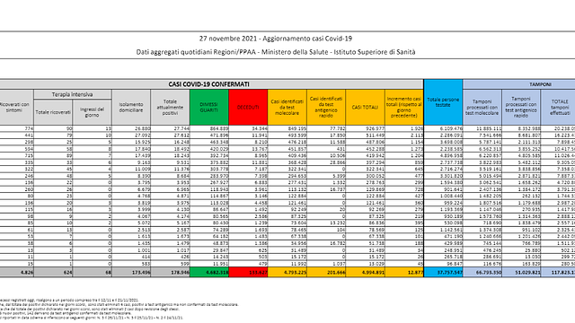 entrate e uscite. Gli ingressi giornalieri sono 68 mentre i ricoverati con sintomi nei reparti ordinari sono 4.826, 78 in più, secondo i dati del ministero della Salute. In isolamento domiciliare ci sono 173.496 persone mentre gli attualmente positivi nel nostro Paese sono 178.946. I casi totali dall'inizio della pandemia sono 4.994.891.