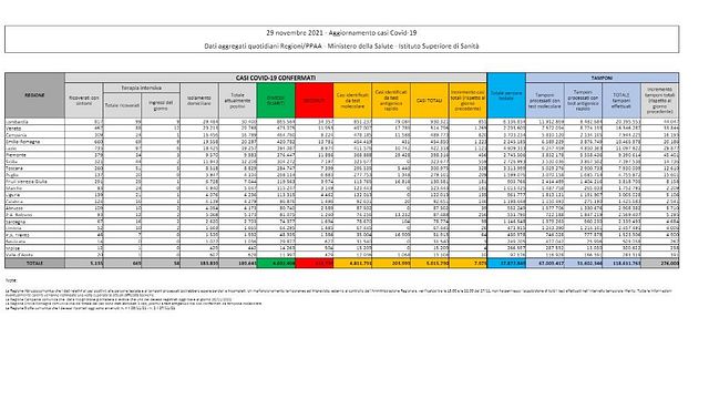 Oggi e un anno fa - Un anno fa, lunedì 20 novembre 2020, si contavano 16.377 casi su 130.524 tamponi, con un tasso di positività ben più alto, al 12,5%. I decessi erano stati 672 e le terapie intensive erano scese di 9, con un totale di 3.744 ricoverati (oggi siamo a 669), mentre negli altri reparti i pazienti Covid erano saliti a 33.187 (308 in più), mentre oggi i ricoverati con sintomi sono in tutto 5.135. Infine, i casi attivi erano 788.471 (-7.300) contro gli attuali 186.443 (+7.497).