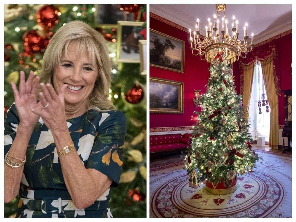 L’abete della Red Room è ispirato ai “piccoli gesti di gentilezza” di ogni giorno, così come voluto da Jill Biden. Alberi natalizi sono stati allestiti anche nella sala delle cene ufficiali e nella Blue Room. Il camino è decorato con calze natalizie, palline rosse e fiocchi, mentre i maxi-pacchi rossi posizionati vicino a porte e finestre richiamano il tema dei doni.