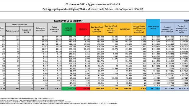 Nelle ultime 24 ore l'Italia registra 16.806 nuovi casi di coronavirus a fronte di 679.462 tamponi. Lo riporta il ministero della Salute, secondo cui i decessi sono 72. I dimessi e i guariti sono 7.650. Continuano a salire le terapie intensive (+12) e i ricoveri (+50). Il tasso di positività si attesta al 2,47%. In totale sono 96.951.797 le dosi di vaccino somministrate.