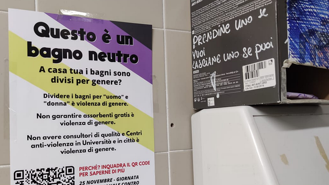 Le altre iniziative - I cartelli bianchi, con bande gialle e viola, riportano anche altri messaggi. "Dividere i bagni per uomo e donna è violenza di genere", si legge. E ancora "Non garantire assorbenti gratis è violenza di genere. Non avere consultori di qualità e centri antiviolenza in università e in città è violenza di genere". Nei bagni infatti, oltre ai cartelli, sono stati posizionati dei cubi di cartone (tampon-box): si tratta di distributori di assorbenti che riportano la scritta "Prendine uno se vuoi, lasciane uno se puoi".