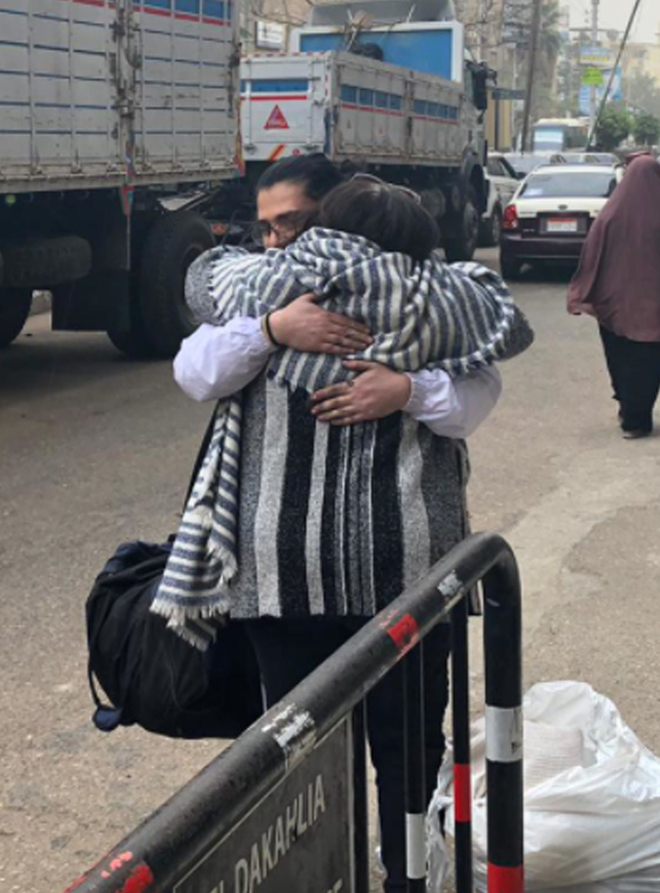L'abbraccio con la mamma - Appena varcata la porta del commissariato, lo studente dell'università di Bologna ha alzato la mano con l'indice ed il dito medio alzati in segno di "vittoria", poi l'abbraccio con la mamma che è avvenuto in una stretta via su cui affaccia il commissariato, fra transenne della polizia del traffico e un camion con rimorchio. Per abbracciare la madre Patrick ha lasciato a terra un sacco bianco di plastica che portava assieme a una borsa nera.