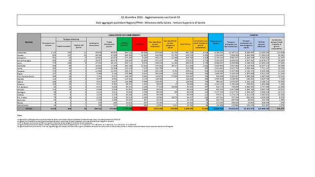 Nelle ultime 24 ore in Italia si sono registrati 21.042 nuovi casi di Covid-19 a fronte di 565.077 tamponi effettuati (venerdì i contagi erano stati 20.497 con 716.287 test). Il tasso di positività odierno si attesta al 3,7%, in aumento rispetto al 2,9% del giorno precedente. I decessi sono stati 96, che portano il totale delle vittime dall'inizio della pandemia a 134.765. Guarite 10.205 persone.