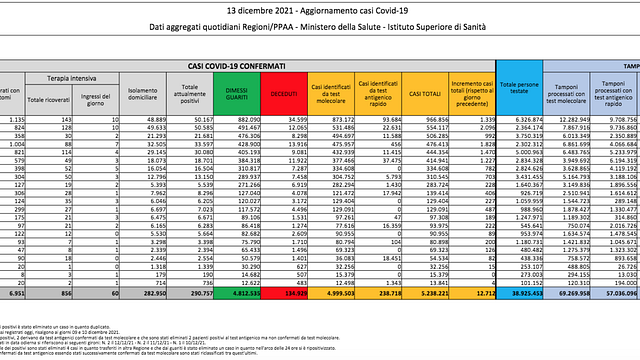 Nelle ultime 24 ore l'Italia registra 12.712 nuovi casi di coronavirus a fronte di 313.536 tamponi (il giorno precedente erano stati 19.215 su 501.815 test). Lo riporta il ministero della Salute, secondo cui i morti sono 98 (domenica erano stati 66). I dimessi e i guariti sono 6.726. Mentre continuano a salire gli ingressi in terapia intensiva (+27) e i ricoveri nei reparti Covid (+254). Il tasso di positività si attesta al 4,1%.