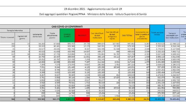 Nelle ultime 24 ore l'Italia registrano 24.259 nuovi casi di coronavirus a fronte di 566.300 tamponi (il giorno precedente erano stati 28.064 su 697.740 test). Lo riporta il ministero della Salute, secondo cui i morti sono 97 (sabato erano stati 123). I guariti sono stati 9.403. Aumentano gli ingressi in terapia intensiva (+13) e i ricoveri nei reparti Covid (+150). Il tasso di positività si attesta al 4,3% (era 4%).