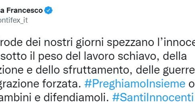 "I nuovi Erode dei nostri giorni spezzano l'innocenza dei bambini sotto il peso del lavoro schiavo, della prostituzione e dello sfruttamento, delle guerre e dell'emigrazione forzata". Lo afferma papa Francesco, in un tweet, nella ricorrenza dei Santi Innocenti. "Preghiamo insieme per questi bambini e difendiamoli", esorta il Pontefice.