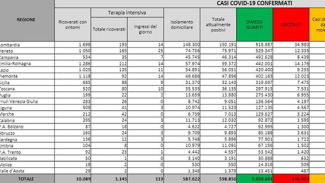 Analizzando i dati regione per regione si registra un picco di casi in Veneto, Lombardia, Basilicata, Campania, Valle d'Aosta e Piemonte. Sono 598.856 gli attualmente positivi, 61.352 in più rispetto a lunedì. Dall'inizio della pandemia i casi totali sono 5.756.412 e i morti 136.955. I dimessi e i guariti sono invece 5.020.601.