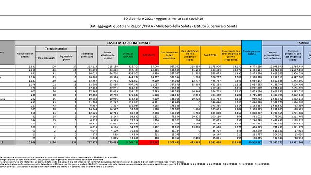 L'Italia registra un nuovo picco di 126.888 casi da Covid nelle ultime 24 ore a fronte di 1.150.352 tamponi (mercoledì erano 98.020 su 1.029.429 test). I decessi sono 156, contro i 148 del giorno precedente. Il tasso di positività si attesta all'11%, in rialzo rispetto al 9,5% di mercoledì. I guariti odierni sono 22.246.