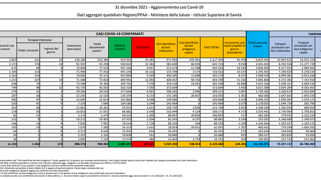 Sono 900.984 gli attualmente positivi al Covid in Italia, 121.521 in più rispetto al giorno precedente. Dall'inizio della pandemia i casi totali sono 6.125.683 e i morti 137.402. I dimessi e i guariti sono invece 5.087.297, con un incremento di 22.579 rispetto a ieri.