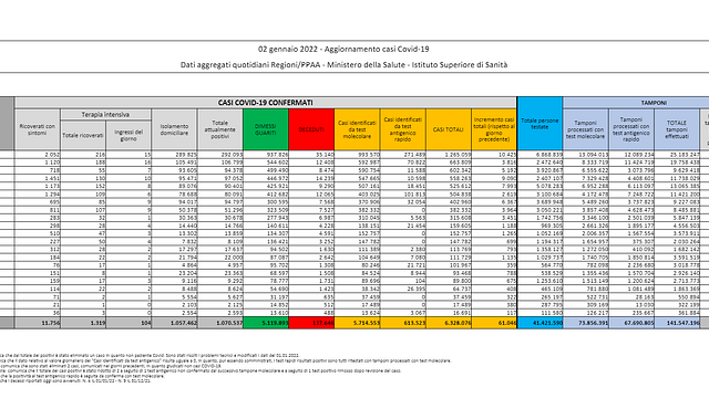 Nelle ultime 24 ore in Italia si sono registrati 61.046 nuovi casi a fronte di 278.654 tamponi effettuati (sabato i contagi erano stati 141.262 con 1.084.295 test). Il tasso di positività si attesta quindi al 21.9%, in forte aumento rispetto al 13% del giorno precedente. Lo riporta il ministero della Salute, secondo cui i morti sono 133, che portano il totale dei decessi dall'inizio della pandemia a 137.646. Guarite 12.164 persone.
