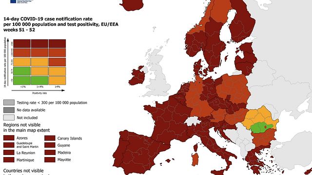 Europa quasi tutta in rosso o rosso scuro Per quanto riguarda l'Europa, secondo la fotografia scattata dall'Ecdc, anche gli altri Paesi Ue sono in rosso o rosso scuro ad eccezione della Romania. Il rosso scuro, che indica un'incidenza dei nuovi casi in forte aumento (oltre 500 casi al giorno ogni 100mila abitanti), copre per intero la Penisola iberica, Francia, Germania, Benelux, Grecia, e anche gran parte dell'Italia (ad eccezione della Sardegna), dei Paesi scandinavi e baltici e dell'Europa centro-orientale. L'unica eccezione è la Romania, dove si trovano le uniche regioni arancioni e verdi in Europa