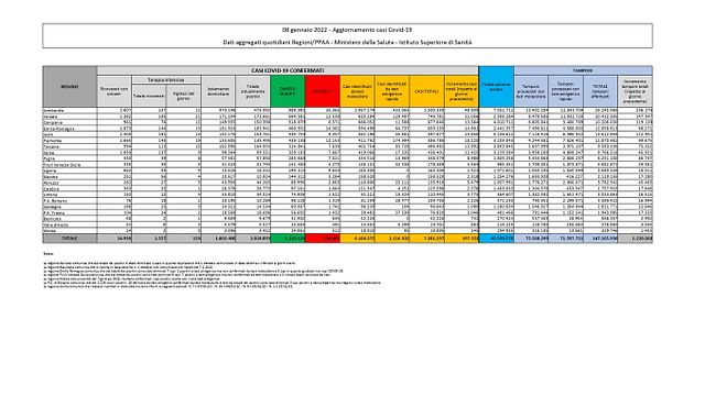Sono 1.818.893 gli attualmente positivi al Covid in Italia, 144.822 in più rispetto al giorno precedente. Dall'inizio della pandemia i casi totali sono 7.281.297 e i decessi 138.881. I dimessi e i guariti sono invece 5.323.523. Analizzando i dati sui ricoveri da lunedì a sabato, l'incremento è stato del 55% nei reparti ordinari sullo stesso periodo della settimana precedente. La variazione degli ingressi in rianimazione è stata invece del +14%.