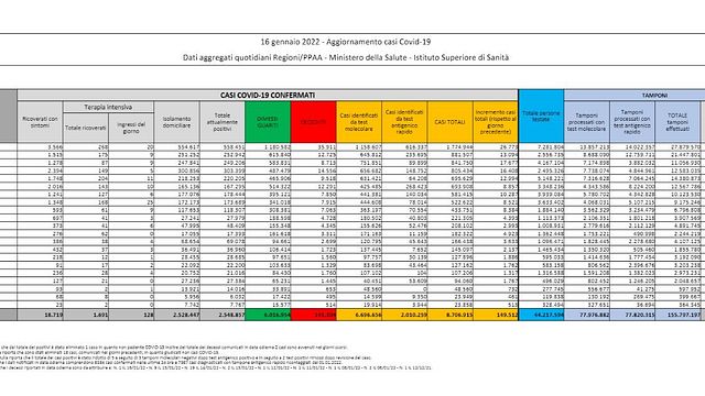 Nelle ultime 24 ore in Italia si sono registrati 149.512 nuovi casi di Covid a fronte di 927.846 tamponi effettuati (sabato i contagi erano stati 180.426 con 1.217.830 test). Il tasso di positività si attesta al 16,1%, in rialzo rispetto al 14,8% del giorno precedente. Lo riporta il ministero della Salute, secondo cui i morti sono 248, che portano il totale dei decessi dall'inizio della pandemia a 141.104. Guarite 79.207 persone.