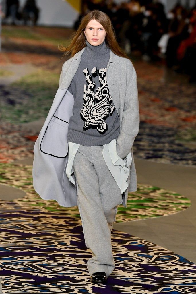 Le materie sono corpose: lana, velluto, seta jacquard, gomma. La silhouette, stratificata e pulita, nasce dalla somma di capi archetipici, letti in chiave Etro: il cappotto, il soprabito da giardinaggio, il pullover inteso anche come outerwear, il caftano, il duvet, la giacca, la camicia stampata, il maglione con lo slogan-calembour. I guizzi della lingua di Etro seguono questo nuovo ordine e pulizia: la rosa è declinata scolasticamente come parola latina su camicie e fodere, o si presenta in forma botanica e stilizzata; il lupo, specie per la cui conservazione Etro si impegna dal 2020 insieme al WWF, è un intarsio o jacquard che sottolinea il percorso nordico e siderale. Motivi in rilievo di cristalli e interruzioni bianche creano effetti sorprendenti sulle superfici. Le sneaker cartoon e le stringate classiche, ai piedi, suggellano la convivenza di giovinezze e età adulta, perché il viaggio del sapere e l’avventura della vita sono appena iniziati.