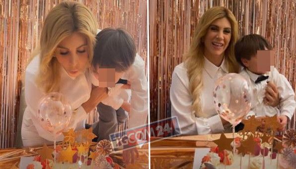 La Caruso ha allestito il salotto di casa con palloncini e festoni tutti sul color oro rosato, caldo e scintillante. Una festa semplice in cui però non ha voluto rinunciare a un tocco glamour. Lei ha scelto un look sobrio, con camicia bianca e pantaloni in tinta. Michelino, con tanto di papillon, era un cavaliere perfetto e ha soffiato sulle candeline insieme alla sua mamma.