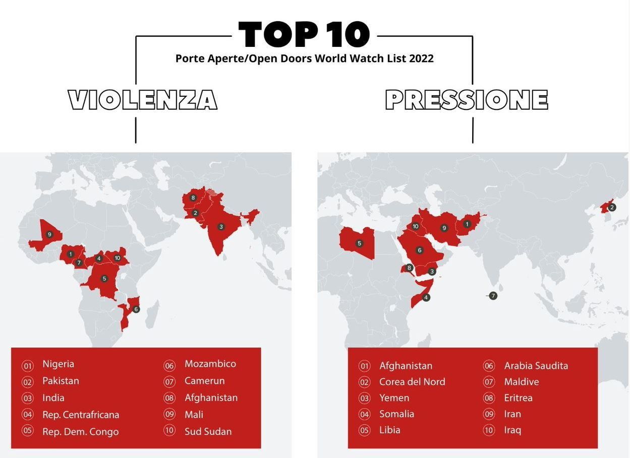 I dieci Paesi dove è maggiore la persecuzione contro i cristiani sono: Afghanistan, Corea del Nord, Somalia, Libia, Yemen, Eritrea, Nigeria, Pakistan, Iran, India.