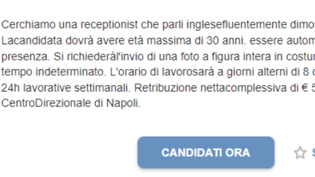 L'annuncio è relativo a un lavoro in un ufficio nel Centro direzionale di Napoli e l'offerta è stata pubblicata anche su diversi siti web specializzati. In alcuni è stata poi corretta, omettendo il "dettaglio" della foto in costume. Tra le altre richieste quella di saper parlare bene l'inglese e avere massimo 30 anni, il tutto a 500 euro al mese per 24 ore a settimana.
