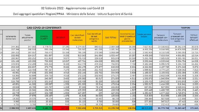 I nuovi casi Covid segnalati nelle ultime 24 ore sono 118.994 su 964.521 tamponi (ieri erano 133.142 con 1.246.987 test), per un tasso di positività pari al 12,3% (ieri +10,7%). Altri 395 morti mentre i guariti sono 187.816. Diminuiscono ancora i ricoveri nelle terapie intensive (-25) e nei reparti ordinari (-323). Scende il numero degli attualmente positivi, che sono 2.407.626, cioè 68.888 in meno rispetto a martedì.