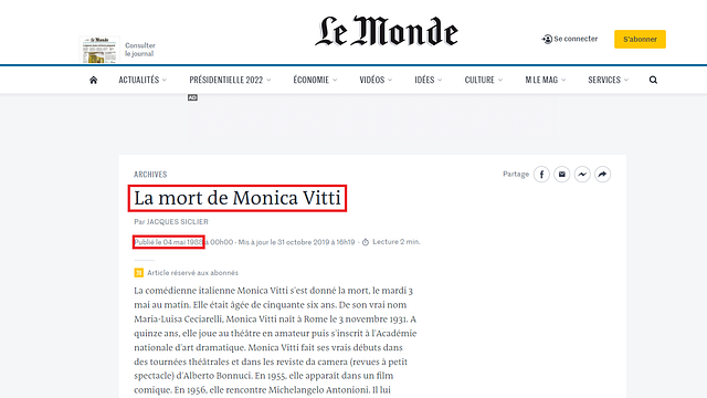 "Rifiutando di invecchiare, nel corso degli anni Ottanta, essa non trova più ruoli e registi realizzatori che le convengono. Dall'universo di Antonioni a quello che aveva ultimamente scelto, Monica Vitti resta per noi una attrice straordinaria e, in un certo modo, un mito", si leggeva nel necrologio pubblicato nel 1988 dal titolo "La morte di Monica Vitti".
