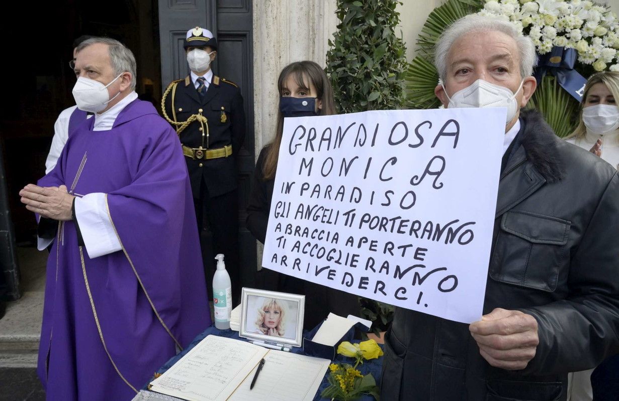 Un mazzo di fiori avvolto nella pagina del Manifesto che il giorno dopo la sua morte ha titolato "Ma 'ndo vai" posato ai piedi della bara vicino a una foto che immortala l'indimenticabile espressività del suo volto. Intorno tante mimose, la scritta "Grazie Monica" e uno schermo con le immagini della sua infinita carriera.
