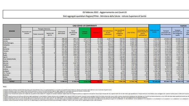 Diminuisce il numero degli attualmente positivi, che sono in tutto 2.128.543, cioè 89.801 in meno rispetto a venerdì, mentre fino ad oggi si contano 148.542 decessi a causa del virus da inizio pandemia. La Regione con il maggior numero di nuovi casi è ancora una volta la Lombardia (11.136 contagi), seguita dal Veneto (10.012) e dal Lazio (9.161). Il numero dei ricoverati è oggi di 1.411 persone in terapia intensiva, con 104 nuovi ingressi, e di 18.615 nei reparti Covid. Diminuisce il numero dei tamponi: 846.480 contro gli 884.893 di venerdì.