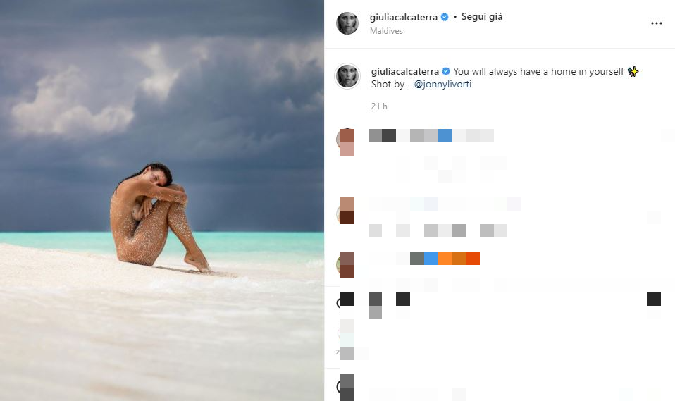 Nuda, seduta sulla sabbia bianca delle Maldive, con le gambe raccolte al petto, la testa appoggiata sulle ginocchia e lo sguardo all'obiettivo, Giulia Calcaterra è una visione celestiale. L'influencer ha trascorso qualche giorno ai Tropici a stretto contatto con la natura, tra lanci con il paracadute e immersioni, senza dimenticare i follower con cui ha condiviso il suo diario fotografico.
