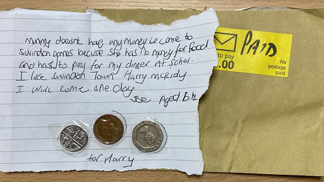 ''La mamma non può venire alle partite dello Swindon perché non ha i soldi per il cibo e deve pagare i miei pasti a scuola. Mi piace molto il giocatore Harry McKirdy. Un giorno verrò allo stadio. Joe, 6 anni e mezzo". E' questo il contenuto di una lettera che un piccolo tifoso dello Swindon Town, club inglese militante in League Two, ha spedito al suo club facendo commuovere tutto il mondo del Web.