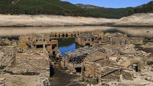 Rimasto sepolto per oltre trent’anni sotto le acque del bacino di una diga artificiale, ora il villaggio abbandonato di Aceredo, in Galizia, è riemerso. La causa è riconducibile al problema della siccità che ha quasi completamente svuotato l’invaso Alto Lindoso che attualmente è solo al 15% della sua capacità.
