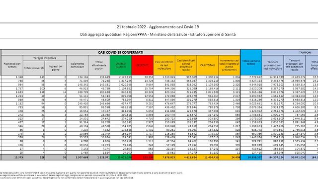 Nelle ultime 24 ore in Italia si sono registrati 24.408 nuovi casi di coronavirus a fronte di 231.766 tamponi effettuati (domenica i contagi erano stati 42.081 su 372.776 test). Il tasso di positività scende al 10,5% (rispetto all'11,3% del giorno precedente). I morti odierni sono 201, per un totale da inizio pandemia di 153.190 vittime. Guarite 50.659 persone. In calo le terapie intensive (-6), mentre i ricoveri negli altri reparti crescono di 91 unità.