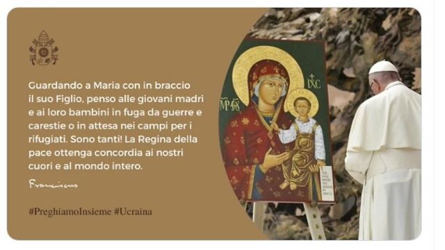 "Penso alle giovani madri e ai loro bambini in fuga da guerre e carestie o in attesa nei campi per i rifugiati. Sono tanti!". Lo dice Papa Francesco in un tweet nel giorno dell'8 marzo dedicato alle donne. Il Pontefice continua i suoi messaggi per la pace in Ucraina, utilizzando oltre alle nove lingue ufficiali del suo account anche il russo e l'ucraino. "La Regina della Pace ottenga concordia ai nostri cuori e al mondo intero", dice il Papa nel tweet che lo ritrae in preghiera davanti ad una icona mariana.