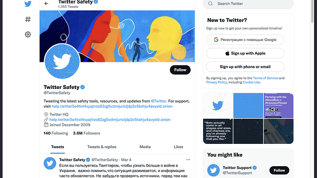 Per bypassare la sorveglianza russa, che ha bloccato l'accesso dal territorio a diversi siti, tra cui anche Facebook, Twitter ha lanciato una versione che si appoggia agli onion services, ovvero server che permettono di connettersi in modo anonimo e di raggiungere direttamente il sito cercato, superando i blocchi territoriali. L'annuncio è stato fatto da Alec Muffett, uno degli ingegneri informatici che hanno lavorato allo sviluppo della versione Tor di Twitter: