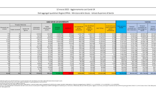 In Italia ci sono 53.825 nuovi casi di coronavirus a fronte di 417.777 tamponi effettuati (mentre il giorno prima l'incremento era stato di 53.127 con 425.638 test). Nelle ultime 24 ore sono stati registrati altri 133 decessi (contro i 156 di venerdì) per un totale, da inizio pandemia, che arriva a 156.782. In terapia intensiva sono ricoverati 513 pazienti (-14) mentre i guariti sono 45.393. Tasso di positività al 12,7%.