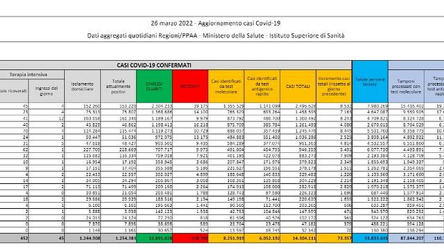 In Italia nelle ultime 24 ore si sono registrati 73.357 nuovi casi di coronavirus a fronte di 504.185 tamponi effettuati (mentre il giorno prima l'incremento era stato di 75.616 con 503.973 test). I decessi sono stati 118 decessi (contro i 146 di venerdì). In terapia intensiva sono ricoverati 452 pazienti (+5). Tasso di positività al 14,5% (ieri era al 15%). I guariti oggi sono 66.396.