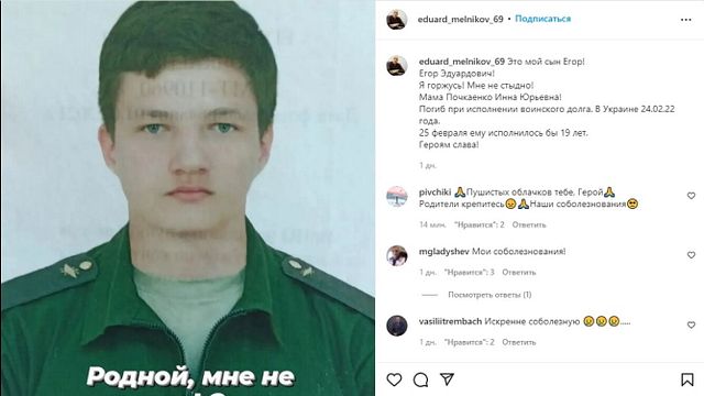 Yegor Melnikov, 18 anni, residente nella città di Belogorsk, regione dell'Amur, è morto nel Donbass il 24 febbraio, il giorno dopo avrebbe compiuto 19 anni. Postumo, gli è stato consegnato un premio statale per il coraggio e papà Eduard lo ha celebrato su Instagram come un eroe. "Questo è mio figlio Yegor Eduardovich - ha scritto pubblicando un'immagine del ragazzo in divisa. - Sono orgoglioso di lui, non mi vergogno! Morto durante il servizio militare in Ucraina il 24.02.22. Gloria agli eroi!".