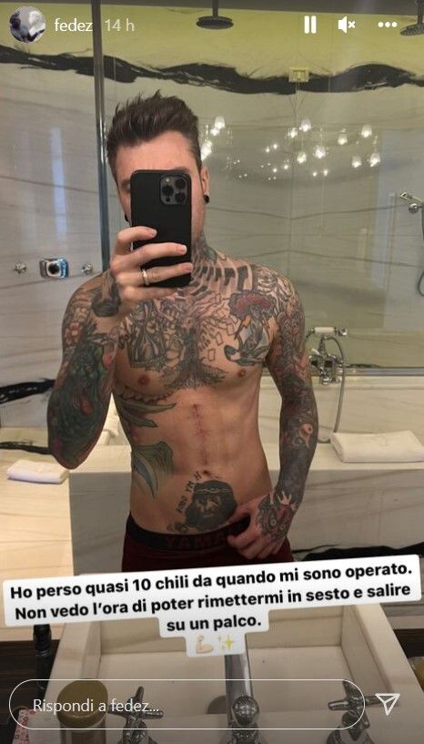 "Ho perso quasi 10 chili da quando mi sono operato. Non vedo l'ora di rimettermi in sesto e salire su un palco", così Fedez scrive in una story Instagram, sotto ad un selfie allo specchio in cui, a petto nudo, mostra la cicatrice dell'operazione al pancreas a cui si è sottoposto a fine marzo. Dopo la convalescenza trascorsa nella sua casa a Milano il rapper si è concesso una fuga pasquale sul lago di Como con la sua famiglia, segno che il ritorno alla normalità è sempre più vicino.