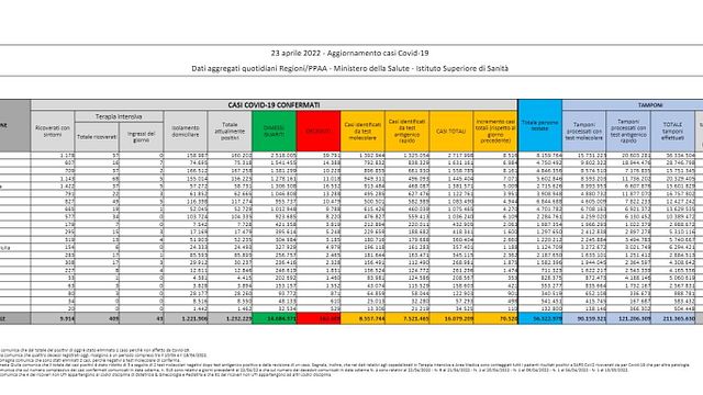 Nelle ultime 24 ore l'Italia registra 70.520 nuovi casi di coronavirus a fronte di 421.533 tamponi (mentre il giorno prima i contagi erano 73.212 su 437.193 test). Lo riporta il ministero della Salute, secondo cui si contano altri 143 morti. Il tasso di positività resta stabile al 16,7% mentre i guariti odierni sono 61.778. Scendono le terapie intensive (-2) e le ospedalizzazioni (-162).
