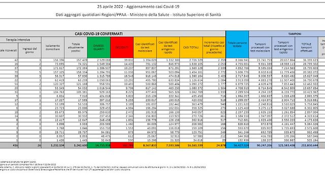 Sono 1.242.600 le persone attualmente positive al Covid, 1.549 in meno nelle ultime 24 ore. In totale sono 16.161.339 gli italiani contagiati dall'inizio della pandemia, mentre i morti salgono a 162.781. I dimessi e i guariti sono 14.755.958, con un incremento di 26.738 rispetto a ieri. Sono 416 i pazienti ricoverati in terapia intensiva, i ricoverati nei reparti ordinari tornano sopra quota 10mila: sono 10.050.