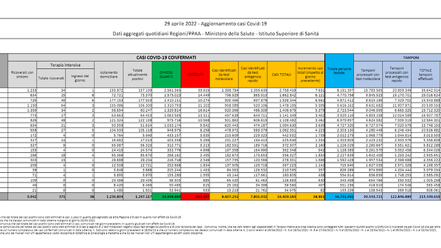 In Italia ci sono 58.861 nuovi casi di coronavirus a fronte di 381.239 tamponi effettuati (mentre il giorno prima l'incremento era stato di 69.204 con 441.526 test). Nelle ultime 24 ore sono stati registrati altri 133 decessi (contro i 131 di giovedì) per un totale, da inizio pandemia, che arriva a 163.377. In terapia intensiva sono ricoverati 371 pazienti (-11) mentre i guariti sono 60.951. Tasso di positività al 15,4%.